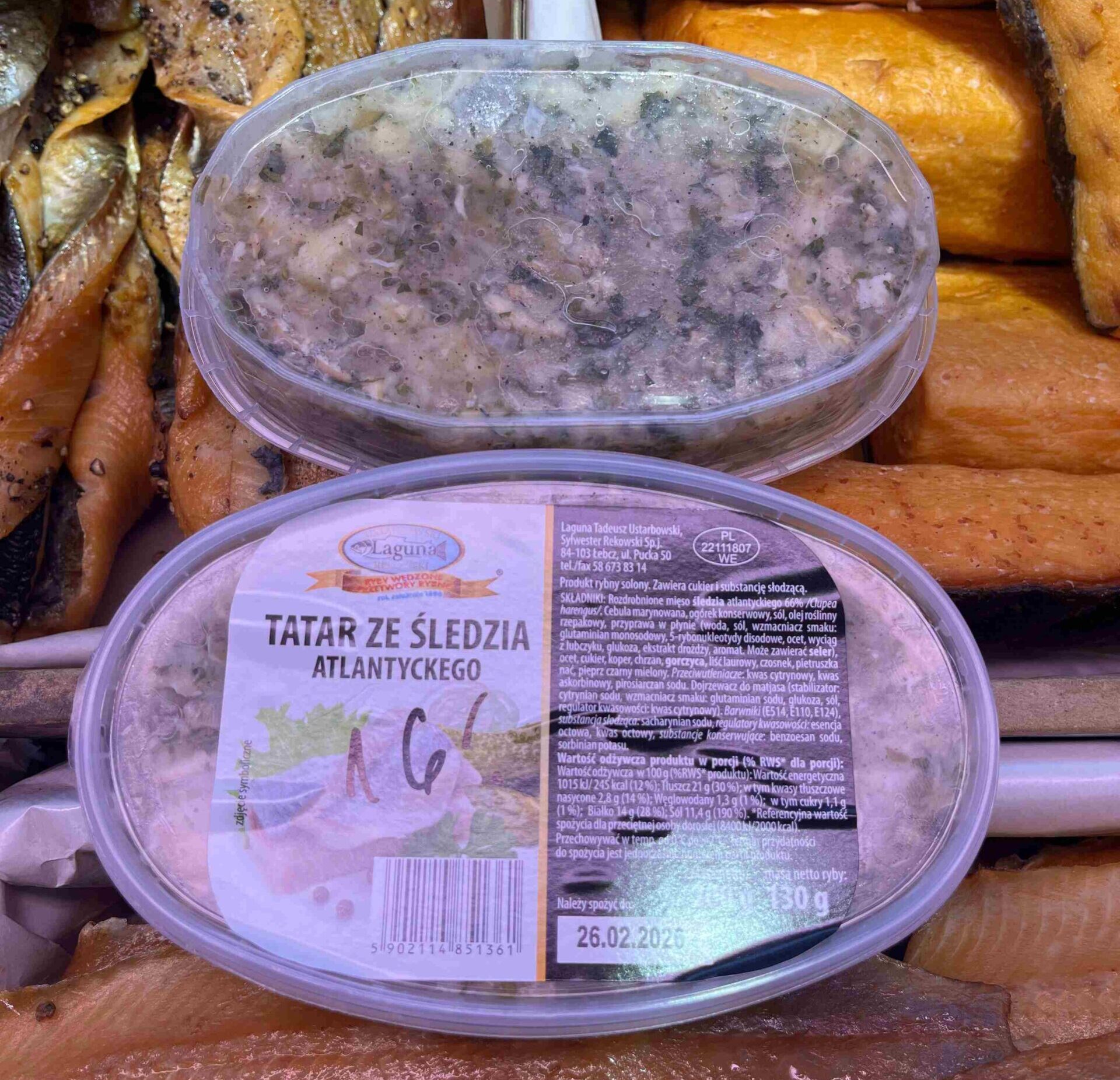 Składniki: rozdrobnione mięso śledzia atlantyckiego 66 % /Clupea harengus/. cebula marynowana, ogórek konserwowy, sól, olej roślinny rzepakowy, przyprawa w płynie (woda, sól, wzmacniacz smaku: glutaminian monosodowy, 5-rybnukleotydy disodowe, ocet, wyciąg z lubczyku, glukoza, ekstrakt drożdży, aromat. Może zawierać seler. ), ocet, cukier, koper, chrzan, gorczyca, liść laurowy, czosnek, pietruszka nać, pieprz czarny mielony. Przeciwutleniacze: kwas cytrynowy, kwas askorbinowy, pirosiarczan sodu. Dojrzewacz do matiasa: (stabilizator: cytrynian sodu, wzmacniacz smaku: glutaminian sodu, glukoza, sól, regulator kwasowości: kwas cytrynowy). Barwniki (E514, E110, E124), substancja słodząca: sacharynian sodu, regulator kwasowości: esencja octowa, kwas octowy, substancje konserwujące: benzoesan sodu, sorbinian potasu.